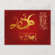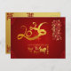 Chinese firecrackers and old Chinese calligraphy of horse in red as background for a large golden 2026 (original handwritting) with golden greeting in Chinese + "HAPPY CHINESE NEW YEAR" + "Year of the Horse" (original handwritting) and golden paper-cut (printed image) of a horse. Design on horizontal greeting card with texts to customize in back on golden textured paper (image printed). Matching greeting card, invitation, and more soon... Perfect for Chinese New Year of The Horse 2026.