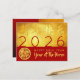Modern design with golden textured paper (printed image) with Large golden Chinese wishes + large 2026 in red + small Horse paper cut-out with yellow texts HAPPY NEW YEAR and Year of the Horse onto a red background. Design on horizontal holiday postcard + texts to customise in back. You can easily change year by clicking the customise button. Matching greeting card, sticker, party supplies and more soon... Perfect for a timeless and modern Chinese New Year of the Horse 2026.