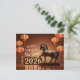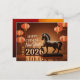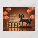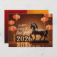 Design by AI with faux old Chinese sculpture of a horse in brown decor with chinese lanterns + "Happy Chinese New Year" and large 3D "2026" + small golden Chinese greetings in vertical position. Design on horizontal holiday postcard with old Chinese ideogram for horse and texts to customize inside. Perfect for Chinese New Year of The Horse 2026.