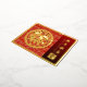An elegant visual of a real gold foil horse with Fu ideogram into a circle (inspired by traditional Chinese paper-cut) overlay a red and yellow traditional Asian pattern and brushed real gold foil border on the front + graphic "HAPPY NEW YEAR" in Chinese and English and old Chinese calligraphy for "Horse" on the right on gradiant red colour band. On the back are the same gradiant background (on the left) for texts to personalise: your message and return address + golden textured paper (image printed) on the right. Design on horizontal real gold foil postcard.