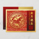 An elegant visual of a red horse with blossoms into a circle (inspired by traditional Chinese paper-cut) with gold circle (image printed) overlay a red and yellow traditional Asian pattern + graphic "HAPPY NEW YEAR" in Chinese and English and old Chinese calligraphy for "horse" on the right on gradiant red colour band. On the back are the same gradiant background (on the left) for texts to personalise: your message and return address + golden textured paper (image printed) on the right. Design on horizontal holiday postcard. You can easily personalise this Lunar New Year postcard by customising the greeting on the back or delete for your handwritten note, type in your return address. Available similar design with golden paper cut-out of horse. Matching real foil holiday postcard.