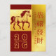 Intemporel illustration of a horse in red colours. Design on vertical holiday postcard + large 2026 + "Year of the Horse" on red background + Wishes in Chinese and English on golden vertical band + texts to customise in back of the card. Matching greeting card, sticker (and more soon)... Perfect for Chinese New Year of The Horse 2026.