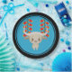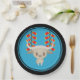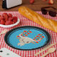 Chinese New Year plates for the year of the white ox with a cute white ox and firecrackers, blue background, and black border.