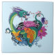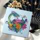 A Chinese green and purple water dragon with an orange koi fish, lotus flowers, cherry blossoms water against a backdrop of blue