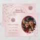 This Save the date card features beautiful dusty pink cherry blossoms, a mauve double happiness symbol and a custom photo. The text on the backside has a pale double happiness symbol in the background.