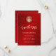 A round gold double happiness symbol on a shimmering red floral background. Save the date text in an elegant handwritten script. Matching Chinese wedding products available.