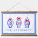 This chic door mat features 3 different ginger jars with red bows. The border around the card is a blue border. You can personalise with your name.