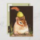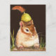 chipmunk peeking out of hole in ground, wearing an acorn/cardinal feather hat