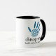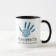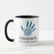 This chiropractic mug features a blue spiral hand print and text that says "Chiropractic - Health Without A Prescription."