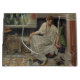 This design features a painting by the English artist Sir Edward John Poynter (1836–1919), who served as President of the Royal Academy of Arts. It depicts a beautiful woman named Chloe who is seated in an elegant portico surrounded by ancient-Roman architecture. She is holding a pair of woodwind musical instruments, like flutes, in one of her hands, and she is holding cherries in the other hand to tempt a small bird that is perched nearby. Chloe is wearing a long flowing toga-like dress and she has green sandals on her bare feet. She has neat brunette hair and she is wearing a colourful necklace. The architecture that surrounds her is painted in all kinds of beautiful colours. There are some tall flowers, including foxgloves and poppies, growing in the garden outside. The coast and the sea can be seen in the distance. The original artwork was painted by Edward Poynter in 1893.