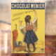 This striking image is an antique image from the late 1800s showing a girl practicing her writing chocolate on the wall. This is a Vintage advertising poster image from 1892. Menier is a French Chocolate company.