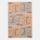 A unique kitchen towel design sports alternating beige and peach blocks with right side up and upside down text blocks of the words chocolate, dark chocolate, almonds in English, German and French plus other words in a variety of font styles, sizes and colours.
