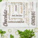A chocolate lover's kitchen towel design sports a word cloud of chocolate, dark chocolate, almonds in English, German and French plus other words in a variety of font styles, sizes and colours. This design is also available in the place mats and napkins.
