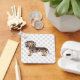 Destei's original cartoon illustration of a cute short hair chocolate brown and tan dapple coat colour Dachshund breed dog. There is also a personalizable text area for a name on the other side. The background has a pattern of grey dog paw prints.