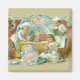 Children Baking with Chocolate - Chocolat Sucard, or Chocolate Sugar, is the front label on this great French Chocolate advertising card. The vintage advertising art shows three children, dressed up as proper bakers with chefs hats and chefs aprons. These children are in their Victorian kitchen, working with chocolate around the old-fashioned table. The little girl is sitting on the floor in the front, grating her chocolate. The boy baker on the right is reading recipes from his chocolate cookbook. The boy chef on the left is opening a packet of chocolate bars, all ready to eat, but we know all good bakers really do use their chocolate to bake cakes and other chocolate goodies, and they really don't eat the chocolate until it's well baked. The background décor is very ornate Victorian swirling patterns, with a blue and white plate taking over the background, and swirls of blue, white, and brown throughout the background of this vintage advertising image. The children are dressed in blue, green, red, and white.