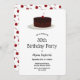 An invitation with a chocolate cake and a background of cherries on the back. All of the words can be customised.