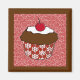 Magnet as a Chocolate fudge cupcake topped with a cherry, in a decorative, red and white cupcake wrapper, on a red and white, Japanese swirl patterned background