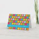 This birthday card design features colourful dots with contrasting outlines on a chocolate brown background. Blue stripe across lower card features funky text that says "Happy Birthday! Happy Birthday!"