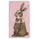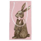 This Easter gift bag has a hand watercolored chocolate bunny with a pink bow. The back has a speckled pattern on a pink background.