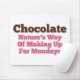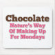 Chocolate, nature's way of making up for Mondays. A cute, funny, humourous chocolate candy saying quote design in pink and brown text font.