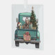 A teal blue pickup truck carries a decorated Holiday tree and gift packages on this cute glass Christmas ornament. Alongside the tree sits a beautiful chocolate brown Labrador Retriever dog wearing a red and white Santa Claus hat. A rustic wooden sign on the back bumper says "Christmas Cheer".