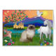 A golden castle, a unicorn, a dove, and a shy rabbit are some of the enchanting elements that form the background for a black and a Chocolate Point Himalayan cat who sits by a crystal blue river.