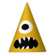 Choice of Colour Kids Monster Face Kids Yellow Party Hats. Customise to change yellow background to any other colour monster face. One eyed sharp toothed monster silly face on the front of this fun hat. Kids monster party themed party supplies and treats.