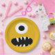 Choice of Colour Kids Monster Face Kids Yellow Party Paper Plates. Customise to change yellow background to any other colour monster face. One eyed sharp toothed monster silly face on the front of these fun plates. Kids monster party themed party supplies and treats.