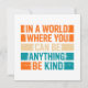 Brighten the world with kindness through this cheerful "In A World Where You Can Be Anything, Be Kind" greeting card, illustrated in vibrant, colourful lettering. This uplifting and motivational artwork promotes positivity, empathy, and compassion, making it a perfect design for spreading good vibes wherever you go. Ideal for teachers, students, mental health advocates, or anyone who believes in kindness as a superpower.