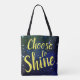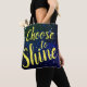 A far out tote bag with a star studded background and the words "Choose to Shine" in yellow script.