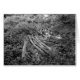 A card with a black and white photo of a chopped up tree arranged in piles in the undergrowth. .