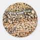 Round photo magnet of chopped wood logs stacked on a pile ready for use in a fireplace.