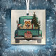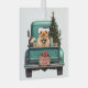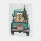 A teal blue retro pickup truck carries a decorated Holiday tree and gift packages on this cute glass Christmas ornament. Looking out from the tailgate is a beautiful red Chow Chow dog. A rustic wooden sign on the back bumper says "Christmas Cheer".