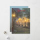 A charming street scene with glowing lamps and decorated shops, softly lit through the evening mist, creating a warm and inviting atmosphere.
