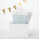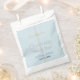 Elegant Christening Son Thank You Paper Favour Bags with simple hand-painted Silver Cross with Gold Accents. Personalise name in blue script, and date in black text against a light blue background. Original Graphic Artwork and Design © TamiraZDesigns.