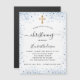 A modern, elegant baptism, celebrating a baby boy. White background decorated with blue faux glitter sparkles and a golden cross. Personalise and add a name and party details. Black coloured letters.