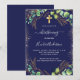 A navy blue background decorated with eucalyptus greenery and golden leaves and faux gold glitter sparkles. A golden cross. Personalise and the child's name and ceremony details.