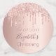 A rose gold background decorated with faux rose gold glitter drips. Personalise and add a date and name/event. Dark rose gold coloured letters. Some confetti chips with name and date, others with a cross. Add your own photo on two of the chips.