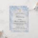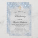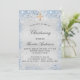 A modern, elegant christening, celebrating a baby boy. Faux silver metallic looking background decorated with blue faux glitter dust and a golden cross. Personalise and add a name and party details. Black coloured letters.
