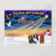 The sun rises revealing three wise men, a Christmas dove and three Cavalier King Charles Spaniels. The words say Peace on Earth. A wonderful Christmas message that also includes your dog in the celebration of the season.