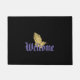 Plush door mat is shown in black and has praying hands and text of Welcome.