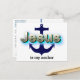 Elegance meets faith with our stunning postcard featuring a solid white background adorned with a navy blue anchor at its centre. Custom typography in faux metallic platinum, edged in gold, radiates shades of blue, blending sky and water visions, with the powerful word 'Jesus' shining brightly across the image. Below, the phrase 'is my anchor' reinforces the message of steadfast faith.