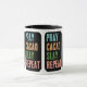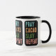 Christian PRAY CACAO SLAY REPEAT Mug in retro vintage colours and grunge serif typography. This quote is a great alternative to the usual EAT SLEEP COFFEE REPEAT slogan and would make an ideal gift for Christians who prefer the benefits of cacao over coffee.