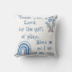 Monogrammed for you to insert your own prayer if you so choose, square, throw pillow. This cute boho theme with a blue rainbow and elephant, and blue text on a white background, states, Thank you, Lord, for the gift of play. Bless me as I go on my way.