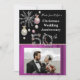 Chic Black and Silver invitation with violet/pink silk that falls like a curtain introducing the photograph of the couple. On the top left, there is a big silver nugget snowflake with few white and dusty rose pearls. There are also two Christmas balls white/light grey and gold / dusty rose and gold with a ribbon introducing the Christmas theme. There is one strand of dusty Rose pink acting as an ornament with the silk pattern.
