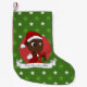 Christmas Stocking with an illustration of a cute smiling African American baby holding a Christmas present and wearing a Santa Claus hat; in a red circle on a green background with stars, a Christmas holidays design with an editable text template for your name or message
