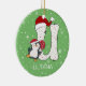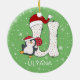 This design features a Christmas Alphabet U with a Santa hat and a cute penguin holding a lollipop with a Santa hat, on a white snowflake pattern green background. A fully Christmas vibes home decoration item. Make it unique by customising it with your name.