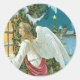 Vintage Christmas card illustration of an angel looking in the window at Christmas.