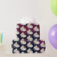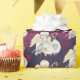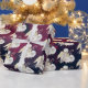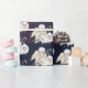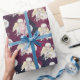 Christian themed wrapping paper with a pattern. Designed with a sweet angel with yellow wings holding a shepherds crook. Sitting with white fluffy lambs. Navy blue and burgundy watercolor background, with tiny flecks of faux gold sparkle glitter (not actual glitter just a printed image).
