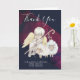 A christian themed christmas thank you card. Designed with a sweet angel with yellow wings holding a shepherds crook. Sitting with white fluffy lambs. Navy blue and burgundy watercolor background, with tiny flecks of faux gold sparkle glitter (not actual glitter just a printed image). Personlize your message. Thank you written in trendy script lettering.
